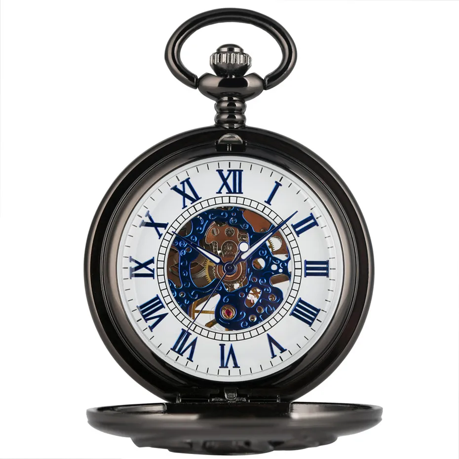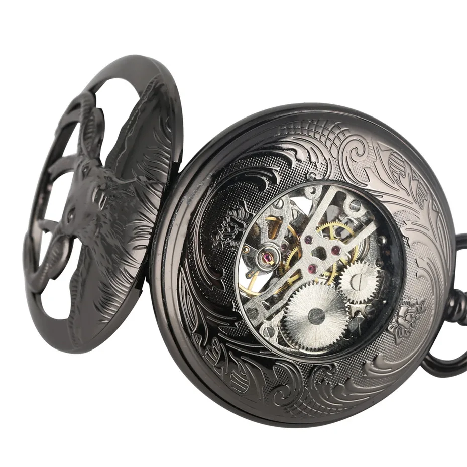 Punk Cool Black Goat Head Design Hand Winding Mechanical Pocket Watch Roman Numerals Dial Retro Sou
